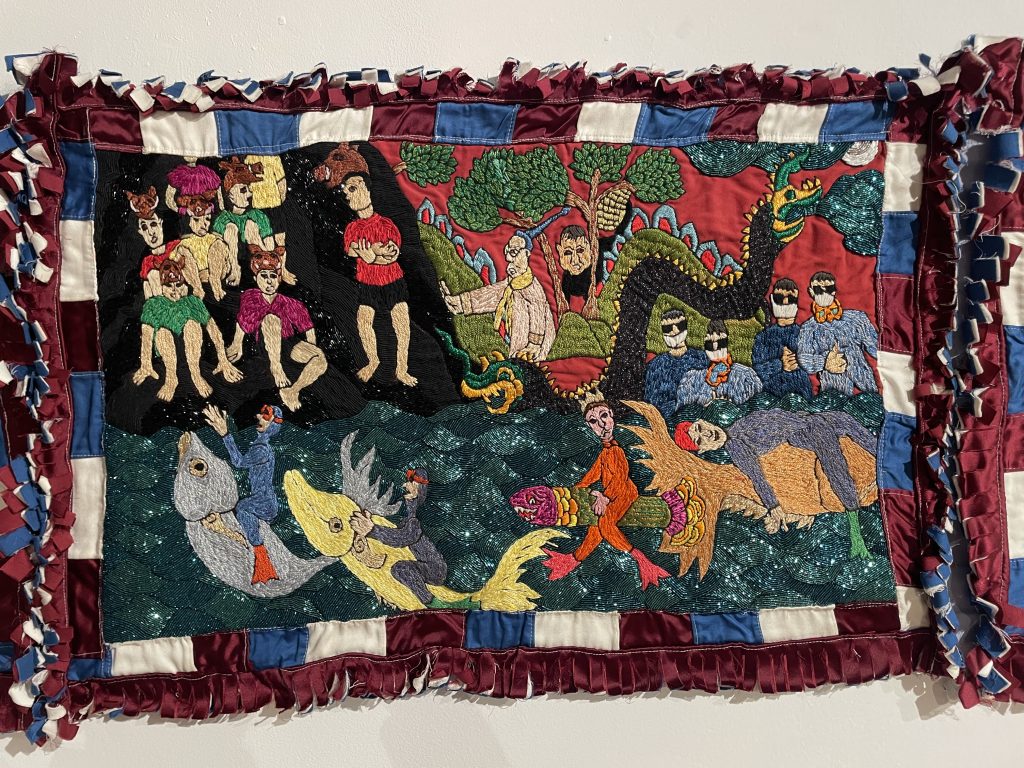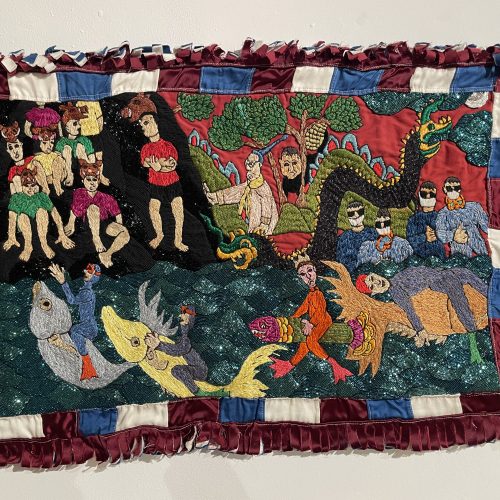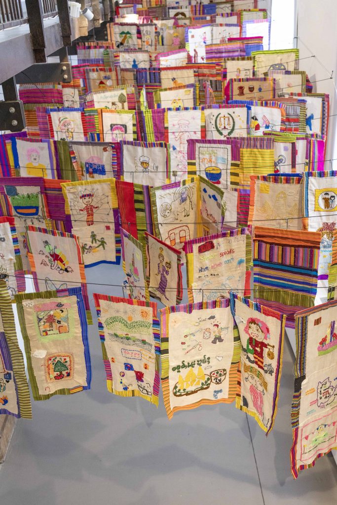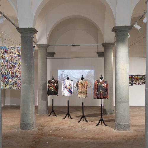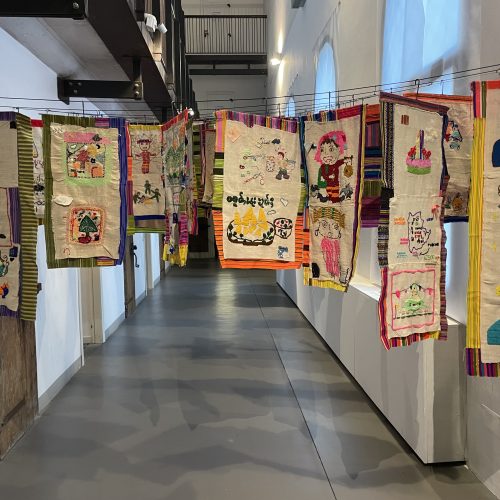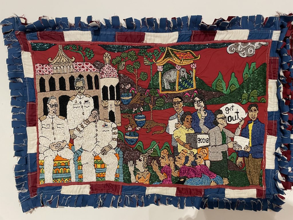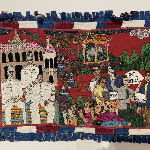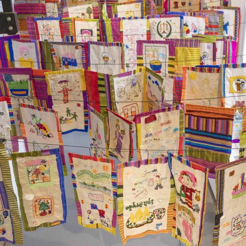 Jakkai Siributr (Bangkok, 1969) lavora con il tessuto attraverso un uso iconico del ricamo, del cucito e del quilting ed è considerato internazionalmente come uno dei più importanti rappresentanti dell’arte tessile, una forma d’arte tradizionalmente legata al genere femminile. La peculiarità della pratica di Jakkai è costituita dalla combinazione di lavoro individuale e relazionale. Interessato infatti ai rapporti umani, allo scambio di esperienze e di storie, talvolta traumatiche, l’artista lavora spesso collettivamente, intercettando comunità principalmente femminili e fragili, con cui realizza sessioni di cucito. Esemplare al riguardo è l’installazione ambientale There’s no Place (2019-in corso), costituita da circa cento pezzi di stoffa ricamati assieme a giovani Shan esiliati dal Myanmar, scelta per essere esposta a MAD. La pratica del cucito è intesa dall’artista come meditativa e terapeutica, ma anche quale strumento partecipativo per dare voce a narrazioni minori, taciute, mnemoniche o ereditarie. I risultati finali dei laboratori combinano tradizione e approccio contemporaneo, attraverso la sovrapposizione e la sperimentazione di tecniche e tipologie di stoffe, talvolta assemblate con vecchi indumenti, tessuti e oggetti personali appartenuti ai partecipanti.