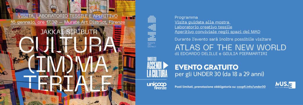 Il MAD – Murate Art District di Firenze invita tutti i giovani under 30 a un appuntamento speciale a cura della Fondazione MUS.E in collaborazione con Unicoop Firenze venerdì 16 gennaio alle ore 17.30, in occasione della mostra Cultura (im)materiale dedicata all’artista thailandese Jakkai Siributr, una delle voci più originali dell’arte tessile contemporanea.